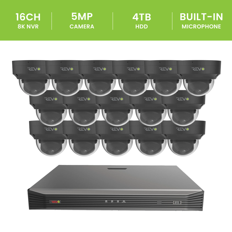 The REVO ULTRA LumeX SERIES combines high-definition clarity with the versatility of IP technology, delivering the ultimate solution in HD surveillance. Featuring a 16CH 4K PoE NVR, a 4TB pre-installed Video Surveillance grade HDD, sixteen advanced 5 Megapixel Vandal Dome cameras and sixteen 100ft CAT5e cables, this system is ready to protect what matters most. Enjoy crystal-clear 5 Megapixel video two and half times the resolution of 1080p Full HD. The cameras offer color night vision, Built-in Microphone, Artificial Intelligence, True WDR, H.265 Compression and Smart IR LEDS. The advanced sensor and illumination technology enable the cameras to capture vivid, full-color video even in extremely low-light conditions. Its night vision quality is unparalleled, ensuring every detail is captured clearly. The 2.8mm wide angle lens offer 105 degrees of coverage. The cameras also feature a built-in microphone for high-quality audio recording. Smart motion detection feature analyzes motion patterns and classifies objects as humans, vehicles or irrelevant motion. This ensures accurate alerts and reduces false notifications. The MyRevocloud.com platform and REVO ULTRA smartphone app offer intuitive remote access, enabling you to view live feeds, adjust settings, and search recorded video with ease. Step into the future of surveillance with the REVO ULTRA LUMEX SERIES system—advanced security made simple and accessible.