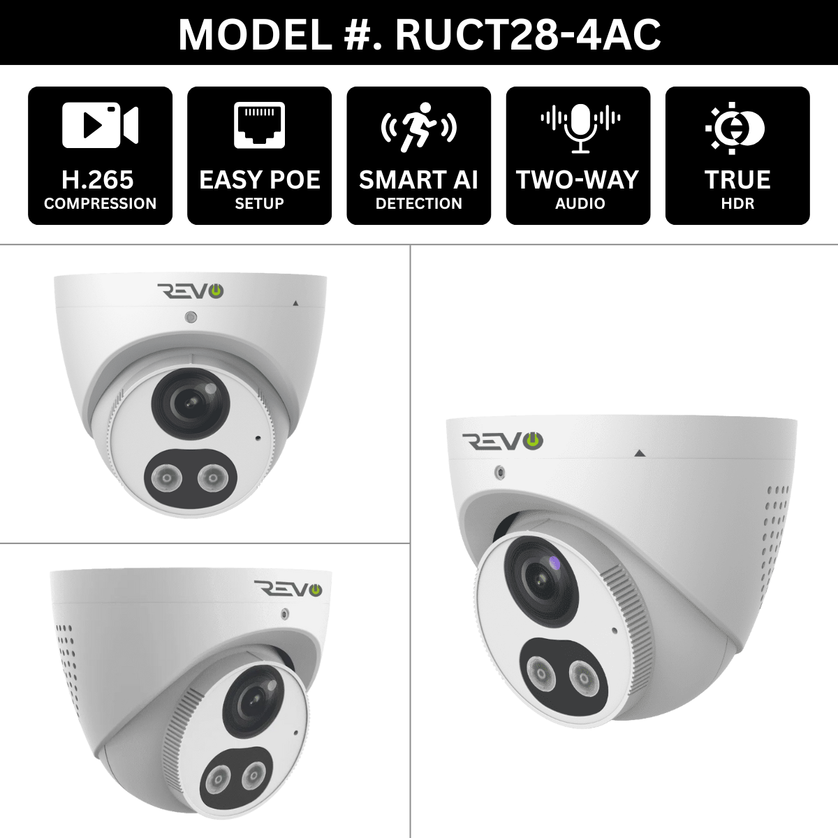 The REVO ULTRA SERIES combines high-definition clarity with the versatility of IP technology, delivering the ultimate solution in HD surveillance. Featuring a 4CH 4K PoE NVR, a 1TB HDD, two advanced 4K (8 Megapixel) active deterrence cameras and two 100ft CAT5e cables, this system is ready to protect what matters most. Enjoy crystal-clear 4K (8MP) video four times the resolution of 1080p Full HD. The cameras are smart security cameras that go beyond traditional passive video surveillance cameras by incorporating active elements that help prevent incidents and crimes from occurring. The camera is equipped with advanced features designed to not only monitor an area but also deter potential intruders or unwanted activities. The RUCT28-4A camera is loaded with state-of-the-art features like active deterrence, built-in Microphone & Speaker, Artificial Intelligence, True WDR, H.265 Compression and Smart IR LEDS. The active deterrence function will ward off intruders by turning on the bright LED lights and audible warning. The MyRevoCloud platform and REVO ULTRA smartphone app offer intuitive remote access, enabling you to view live feeds, adjust settings, and search recorded video with ease. Step into the future of surveillance with the REVO ULTRA SERIES system—advanced security made simple and accessible.